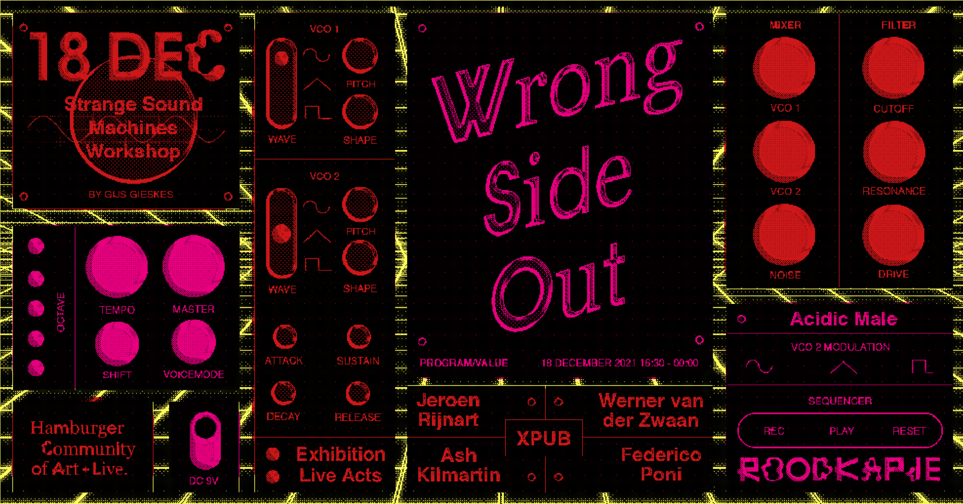 Mark your calendars for our almost-end-of-the-year party called WRONG SIDE OUT. Where the Roodkapje Hamburger Community LIVE residents join forces to wrap up the year. The residents are working tirelessly to bring us a deranged blend of experimental electronica, live performances and deviant music put together to create a one day programme to end your year in total confusion.